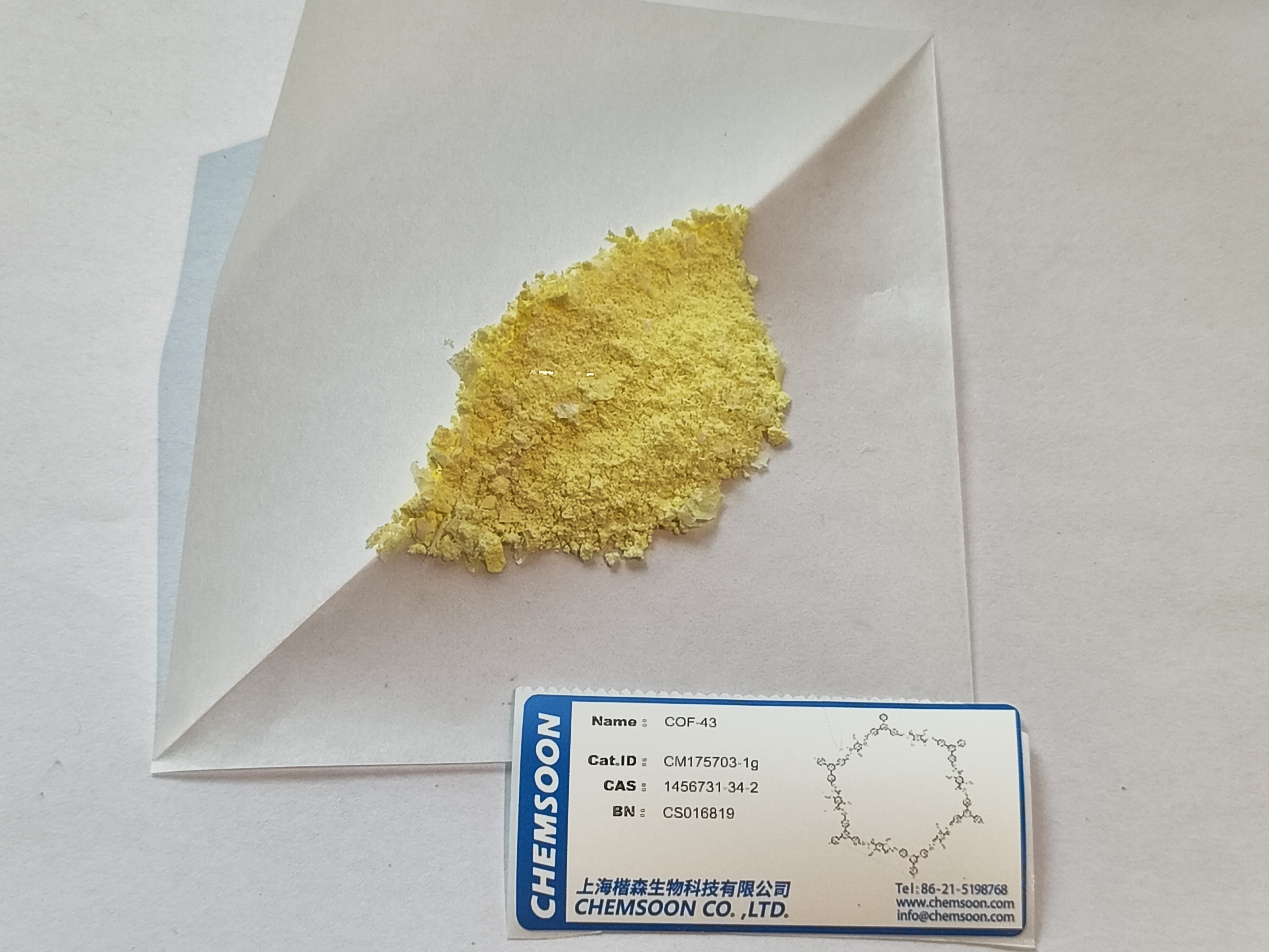 材料名称:COF-43 其他名称:1,4-Benzenedicarboxylic acid, 2,5-diethoxy-, 1,4-dihydrazide, polymer with 5′-(4-formylphenyl)[1,1′:3′,1′′-terphenyl]-4,4′′-dicarboxaldehyde CAS: 1456731-34-2